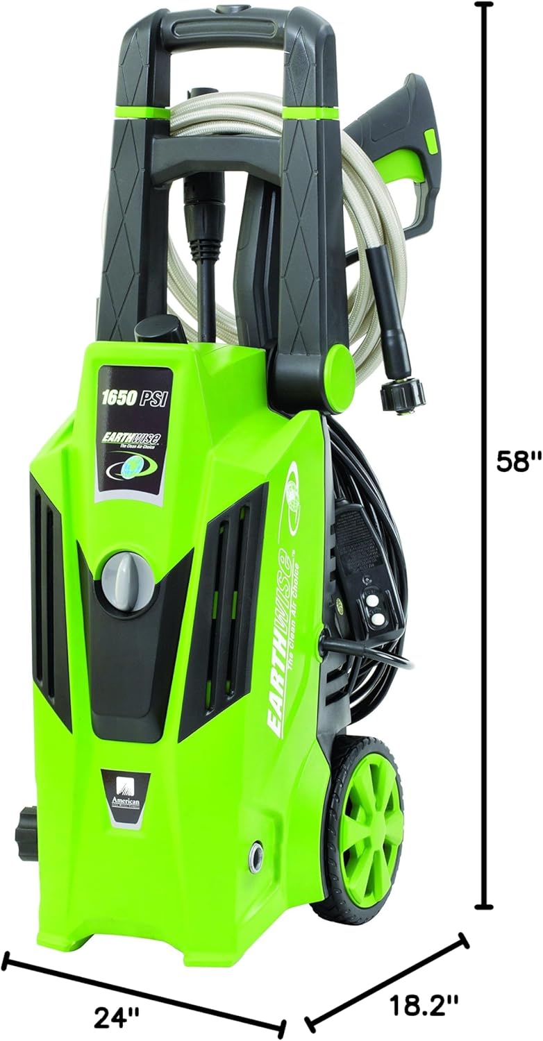 Product Description If you are looking for a good pressure washer that can make cleaning more convenient for you, Earthwise Power Tools by ALM PW16503 is your ideal cleaning companion. It can conveniently be connected to your tap for water and the 1.4 GPM universal brush motor will do its job to give you 1650 PSI of power to get outdoor cleaning done in no time. There is also included an optional soap bottle for your cleaning satisfaction. This electric pressure washer is planet-friendly because it does not need oil or fuel to run, so it does not emit fumes. From the Manufacturer The 12.5 Amp 1,650 PSI Pressure Washer from Earthwise turns standard 120-Volt electricity into 1,650 PSI of power-washing force that's perfect for a variety of jobs around the home. The telescopic three position handle, built in wheels, built-in quick hose connector and a 20 ft. fiber reinforced high pressure hose improves mobility and functionality. Easily adjust the spray gun to suit your needs. This power washer also has a built in detergent tank. And it operates in both horizontal and vertical positions for added convenience. There is no gas needed, so there are no fumes. The 35-foot power cord with UL/GFCI plug will reach to your outlets easily. Earthwise is The Clean Air Choice!