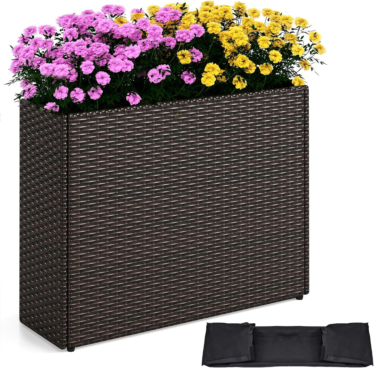 Description:Enhance your gardening experience with the rolling rattan planter. Crafted from premium PE rattan, the woven exterior offers a lightweight and easy-to-clean surface, making maintenance and movement a breeze. Plus, 3 universal wheels and 2 lockable casters provide stable placement wherever you decide to set it up. Thereby, the elevated planter box is suitable for backyard, patio, front porch or living room. Additionally, a detachable lining with convenient hook & loop fasteners can protect the garden bed from soil contact and help to minimize water loss. Furthermore, thoughtfully included drainage gaps encourage excess water to escape, preventing root issues and promoting healthy growth. Supported by reinforced metal pipes, this planter boasts a robust weight capacity of 66 lbs/30 kg, making it ideal for a wide range of flowers, herbs, or vegetables.Features:Premium mixed brown PE rattan weaving is easy-to-maintain and lightweightWaterproof PP panel ensures long-lasting performanceDetachable lining can maintain optimal soil conditions and reduce water lossEasily reposition your raised garden bed anywhere with 3 universal wheels2 lockable wheels prevent unwanted movement Drainage gap helps promote excess water to drain outReinforced metal pipes ensure an impressive weight capacity of 66 lbs/30 kgSpecifications:Color: Mixed BrownMaterial: PE, Metal, PPProduct Dimensions: 38" x 12" x 14"/95 x 30 x 35.5 cm (L x W x H)Interior Size: 36" x 10.5" x 10.5"/91 x 26 x 26 cm (L x W x H)Weight Capacity: 132 lbs/60 kgNet Weight: 12.5 lbs/5.5 kgPackage include:1 x Raised Garden Bed1 x User’s Manual