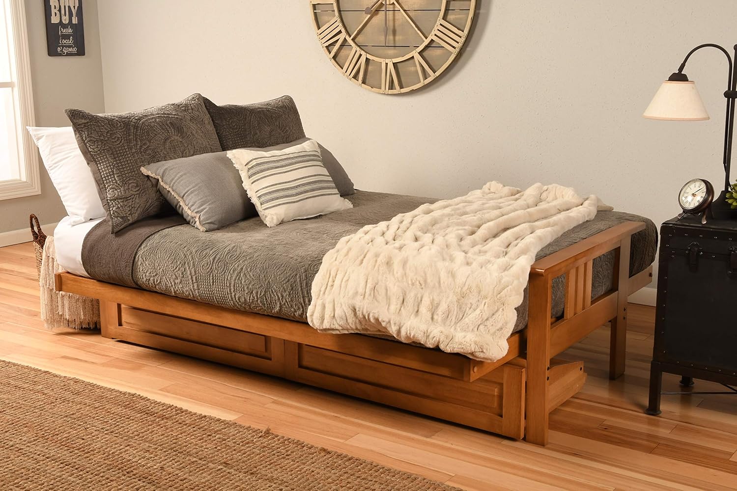 The Monterey futon features a classic hardwood frame with Mission style arms. This unique and versatile full-size futon sofa easily converts to a queen-size bed. This multifunctional piece of furniture can find a home in just about any type of room. The included mattress measures 80L x 60W x 8H and has 324 coil hinged Springs for extra comfort.