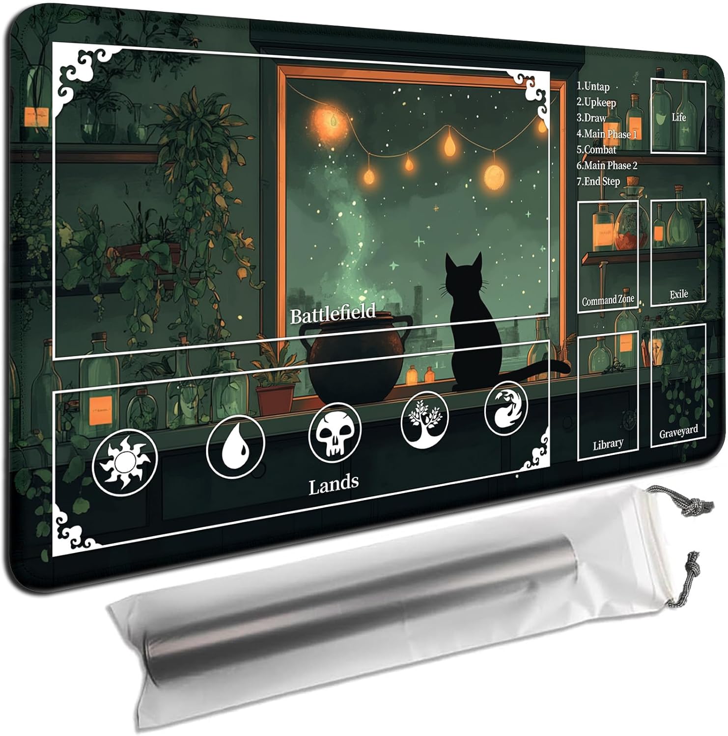"Upgrade Your MTG Experience with a Zoned Playmat!This MTG Playmat with Zones (24x14 inch) is specially designed for Magic the Gathering players who want a more organized and enjoyable gameplay experience. The playmat features designated areas for Library, Graveyard, Battlefield, Command Zone, Exile, Lands, and Life tracking, along with turn sequence reminders to guide you through each phase of the game.Crafted with a smooth cloth surface and non-slip rubber base, the mat allows your cards to move seamlessly while staying securely in place. Its durable construction ensures long-lasting use, whether for casual play, tournaments, or Commander nights.Not only for Magic the Gathering – this versatile playmat is also compatible with other trading card games like Yu-Gi-Oh, Pokémon, Digimon, and more. The included Storage bag makes it easy to roll up and carry your playmat anywhere you go.Whether you're a new player learning the zones or a seasoned Commander competitor, this playmat is the perfect companion for every duel."